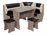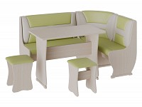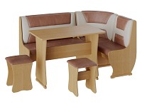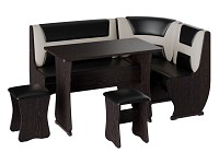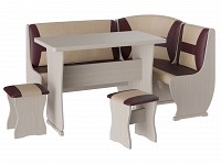 Гармоничный комплект из углового дивана, стола и двух табуретов уютно впишется в обстановку и подарит максимальную практичность.