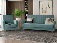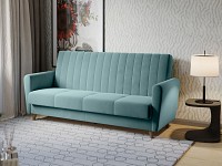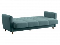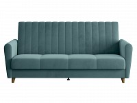 Высокая спинка с вертикальной стежкой позволяет удобно расположиться человеку любого роста. Диван легко складывается и раскладывается, превращаясь в полноценную кровать. В качестве наполнения используется независимый пружинный блок, который обеспечивает ортопедическую поддержку тела. Для постельных принадлежностей есть небольшой бельевой короб. Ножки делают конструкцию визуально легче и позволяют использовать для уборки робот-пылесос.