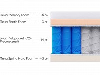 Elastic Foam — гипоаллергенный слой средней жесткости. Пена Memory Foam с эффектом «памяти» способствуют полноценному расслаблению, ускоряя засыпание. Такая структура усиливает анатомические свойства каждого слоя и способствует качественному восстановлению сил. Матрас отлично подходит для любой позы сна.