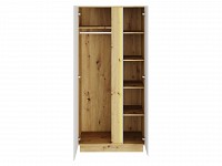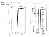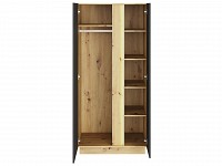 Внутреннее наполнение подразумевает отделение с продольной штангой для вешалок, антресольную полку и ряд ниш для упорядоченного хранения сложенной одежды. Распашные дверцы оснащены петлями с доводчиками, что обеспечит их плавное и бесшумное закрытие.