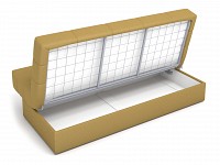 На время сна он легко превращается в ровное спальное место без неудобных стыков и перепадов высоты. Ящик для белья стоит на полу, поэтому в нём можно хранить достаточно тяжелые вещи. Чехол легко снимается без помощи специалиста для стирки или смены на модель в другом дизайне.