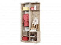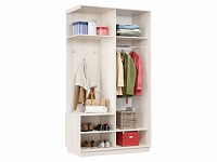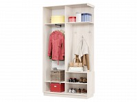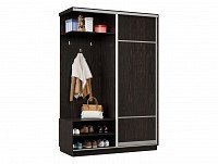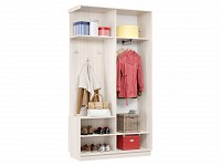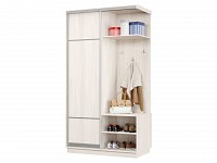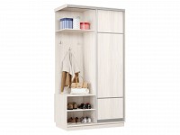 Конструкция поделена на две равные по размеру секции: отделение со штангой для вешалок и нишу с полками и крючками для верхней одежды. Отличительная черта модели — дверь, которая перемещается по однополосному треку вправо или влево, поочередно открывая и закрывая каждую из секций, что важно для узкого коридора.