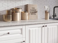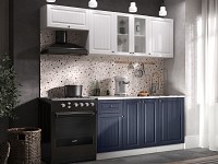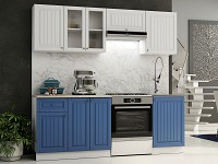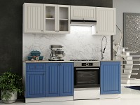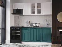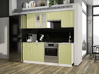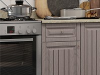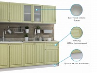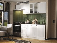 Фасады с фрезеровкой и ручками-кнопками отлично смотрятся в разных интерьерных стилях: от классики до прованса. Внутри достаточно места для хранения посуды, круп и специй, а также техники. Навесной элемент со вставками из стекла делает гарнитур визуально легче.