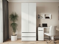 В нише со штангой можно аккуратно развесить деликатные вещи и верхнюю одежду, а внизу удобно хранить белье, трикотаж и аксессуары. Ящики открываются за скошенный край фасадов, а дверцы — с помощью миниатюрных ручек.