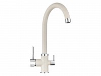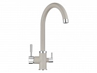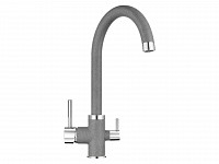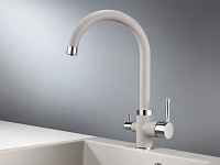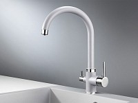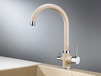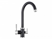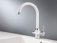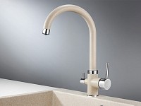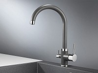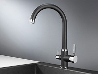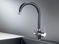 Кран с фильтром для питьевой воды позволяет набирать свежую жидкость без примесей. С помощью удобных рычагов управления можно легко настроить нужные температуру и поток.