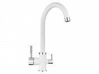 Кран с фильтром для питьевой воды позволяет набирать свежую жидкость без примесей. С помощью удобных рычагов управления можно легко настроить нужные температуру и поток.