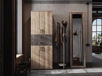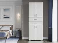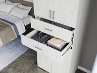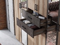 Выдвижные ящики по центру — очень удобное решение. Чтобы увидеть содержимое и найти нужную вещь, не нужно наклоняться и тянуться вглубь шкафа. Лаконичный дизайн модели удачно сочетается с большинством современных интерьеров.