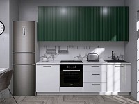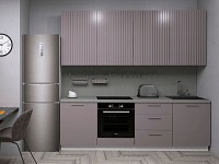 Особенность дизайна заключается в сочетании разных фактур. Верхний ряд шкафов служит акцентом гарнитура, а нижний — зрительно увеличивает пространство. Модули позволяют органично вписать бытовую технику и разместить под рукой всё необходимое для приготовления пищи.