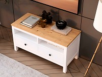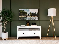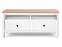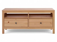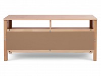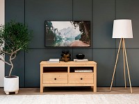 Открытые ниши и пара выдвижных ящиков обеспечат удобное хранение и помогут поддерживать порядок в гостиной. Благодаря высоким ножкам под тумбой легко проводить уборку. Мебель из массива дерева отличается уютной эстетикой, прочностью и долговечностью.