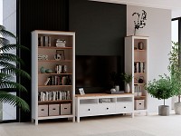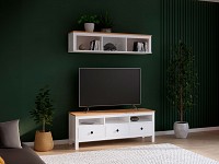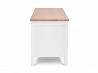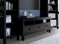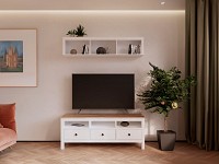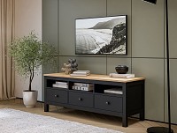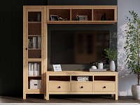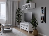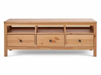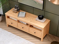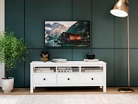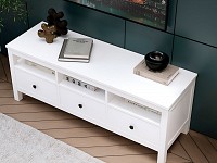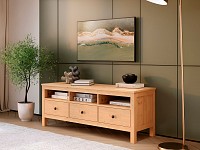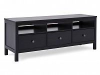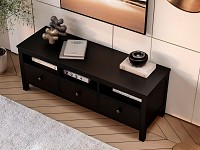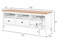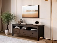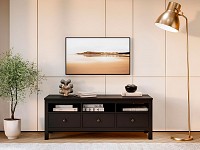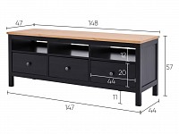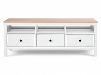 Широкая столешница позволит разместить телевизор большой диагонали. В ящиках можно спрятать разные мелочи, зарядные устройства и аксессуары для техники. Благодаря высоким ножкам тумба не выглядит громоздко.
