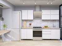 Дверцы ящиков и шкафов не имеют лицевой фурнитуры и открываются захватом рукой за тыльный край фасада, что смотрится современно и упрощает уход за поверхностью. Столешница в оттенке натурального дерева делает гарнитур уютнее, а регулируемые опоры помогают справиться с небольшими неровностями пола.