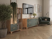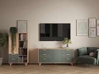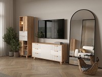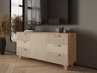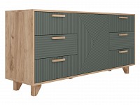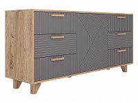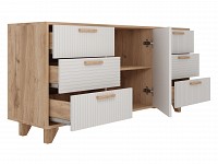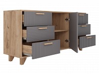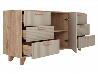 Выдвижные ящики обеспечивают быстрый доступ к содержимому. Древесная текстура, фасады с необычной фрезеровкой и акцентные ножки создают атмосферу уюта и тепла.