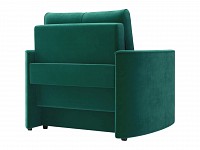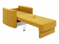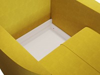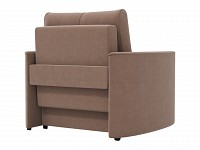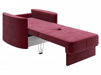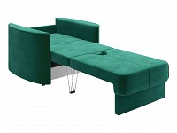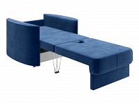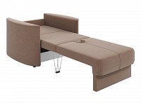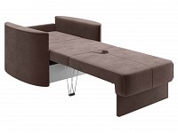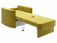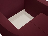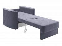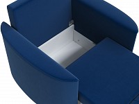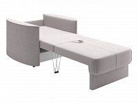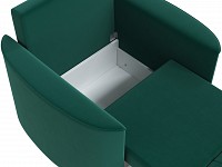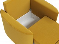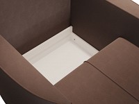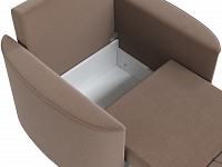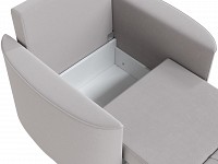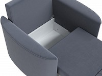 Оригинальная форма подлокотников подчеркивает актуальный дизайн модели. Со всех сторон используется основной материал, поэтому кресло можно поставить не только у стены. Благодаря компактным габаритам модель поместится даже в небольшой комнате. Кресло легко раскладывается, образуя дополнительную спальную зону. В бельевой ящик удобно спрятать плед, подушки и другие вещи.