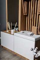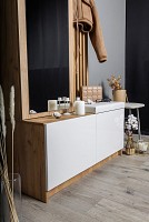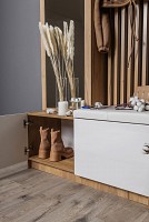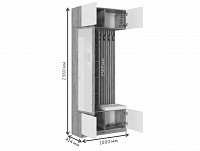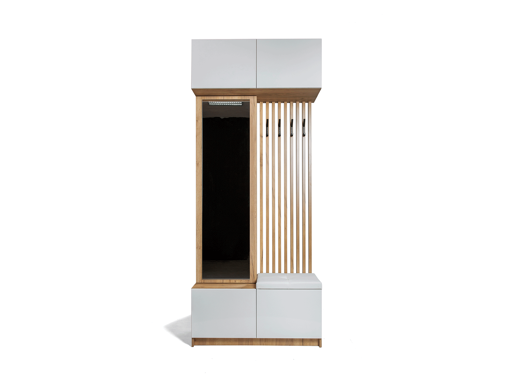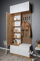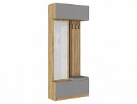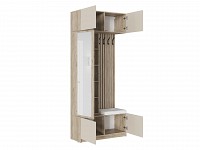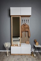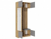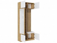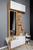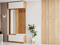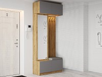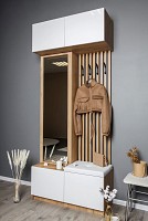 Модель включает несколько отделений за распашными фасадами, удобные крючки, большое зеркало и мягкое сиденье.