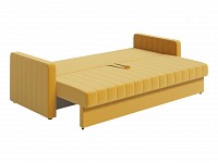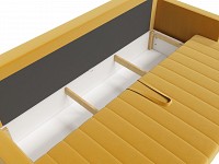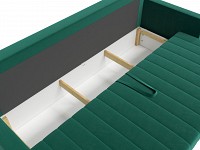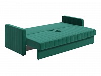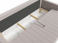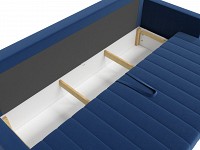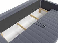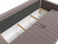 Спинка выполнена в основной ткани, поэтому диван можно поставить в любой точке комнаты. С помощью удобного механизма трансформации модель быстро превращается в полноценное спальное место. Конструкция проста в использовании и рассчитана на частое использование. Просторный бельевой короб — практичное дополнение системы хранения.