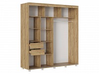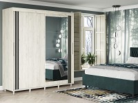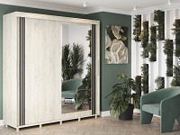 Внутреннее наполнение состоит из секций со штангой и полками, выдвижных ящиков и антресольных ниш. Такое разнообразие позволяет удобно разместить любые предметы гардероба. Раздвижные двери открываются плавно и бесшумно. Зеркало визуально расширяет пространство, а декор в виде вертикальных линий подчеркивает строгий силуэт мебели.