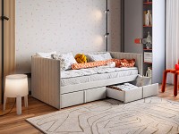 Современная модель поможет обустроить комфортный уголок для отдыха и сна. Кровать со всех сторон обита мягкой тканью, что снижает риск травмироваться об острые углы.