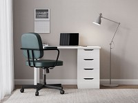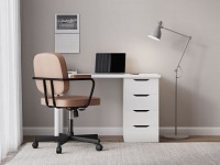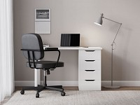 На столешнице можно разместить стационарный компьютер, ноутбук и настольную лампу, а в выдвижных ящиках — хранить документы и другие необходимые предметы. Стул регулируется по высоте, а благодаря колесикам его легко передвигать по комнате.