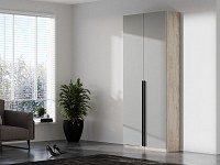Внутреннее наполнение с разноуровневыми штангами оптимален для вещей, которые нужно хранить на плечиках. Матовые фасады и акцентные ручки подчеркивают минималистичный облик модели. Зеркальная поверхность визуально расширяет пространство.