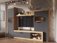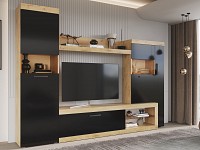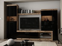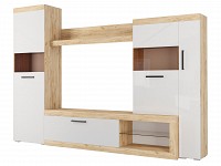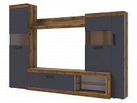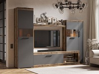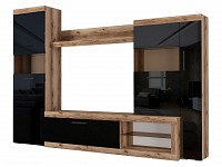 Стенка отлично впишется в любой интерьер в современном стиле. Имитация фактуры дерева и глянцевые фасады со вставками из тонированного стекла соответствуют последним тенденциям в мире корпусной мебели.