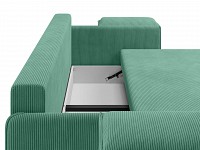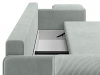Ровное и просторное спальное место — еще одно преимущество дивана. Шагающий механизм трансформации не портит напольное покрытие и не задевает ковер. В небольшом бельевом коробе удобно хранить постельные принадлежности или сезонные вещи.