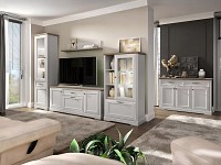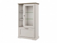 Дверца со стеклом позволит продемонстрировать книги, посуду или коллекционные предметы, при этом защитит содержимое от пыли. Открытые полки подходят, чтобы дополнить интерьер элементами декора. Объемные рамки на фасадах создают интересный акцент меблировки.