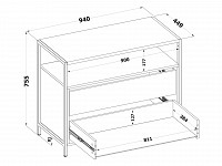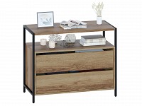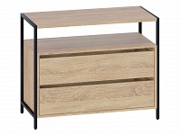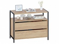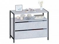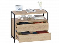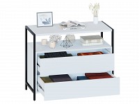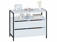 В выдвижных ящиках удобно хранить документы, личные вещи и аксессуары. Отличительная особенность модели — отсутствие ручек, вместо которых между фасадами предусмотрены специальные вырезы. Металлические опоры придают комоду стильный вид.