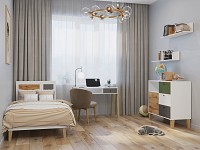Выдвижные ящики обеспечат быстрый доступ к одежде и аксессуарам. За распашной дверцей можно спрятать объемные игрушки. Современный дизайн с контрастными фасадами подарит пространству индивидуальность и уют.