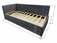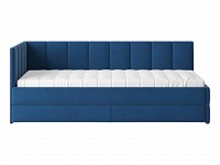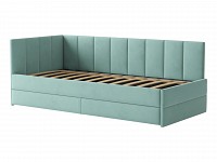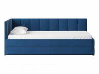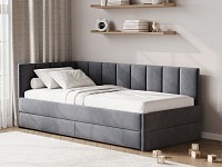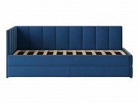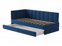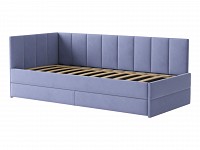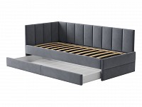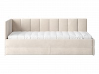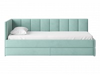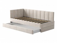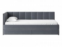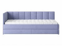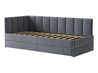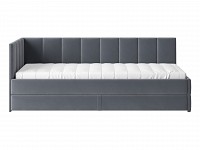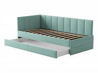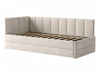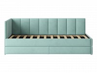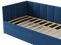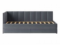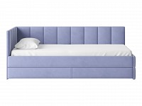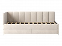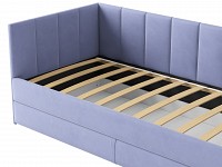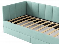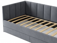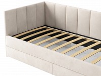 Мягкая обивка приятна на ощупь и создает дополнительные безопасность и комфорт. Спинка украшена декоративной строчкой. Основание с ламелями обеспечивает приток воздуха к матрасу. Выкатной ящик на роликовых опорах поможет аккуратно хранить постельные принадлежности.