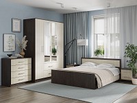 Для гардероба предусмотрен вместительный шкаф с полками, выдвижными ящиками и зеркалами, а для других вещей — комод и пара тумбочек. Сочетание различных фактур и натуральных оттенков обеспечит особую атмосферу комнаты и добавит акценты в интерьер.