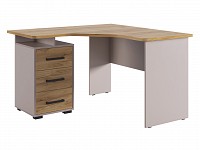 Угловая конструкция экономит место и позволяет адаптировать модель даже в небольшом пространстве. Тумба с выдвижными ящиками и открытой нишей прямо под столешницей позволяет организовать аккуратное хранение документов и канцелярии. Лаконичный дизайн с сочетанием светлых фасадов и фактуры дерева гармонично смотрится в большинстве современных интерьеров.