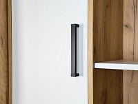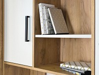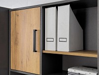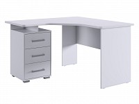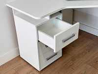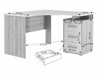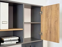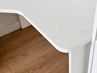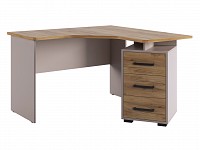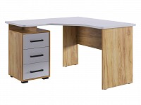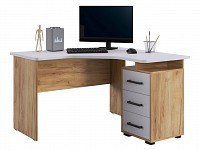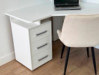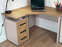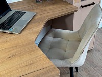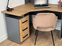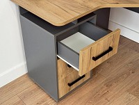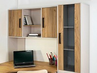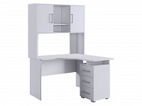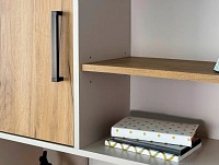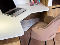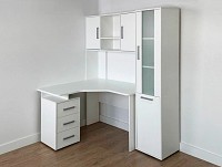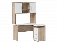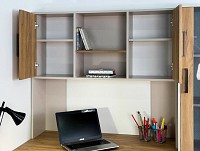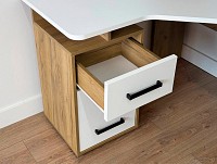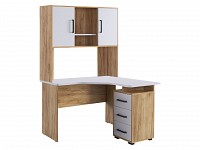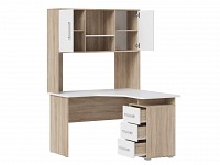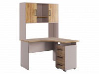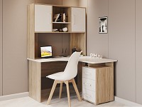 Угловая конструкция экономит место, а надстройка с распашными шкафчиками и открытыми нишами позволяет удобно хранить книги, документы и декор. Тумба с выдвижными ящиками расширяет систему хранения, помогая держать под рукой полезные мелочи. Светлые матовые фасады и столешница удачно сочетаются с фактурой дерева, создавая современный облик мебели.