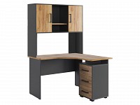 Угловая конструкция экономит место, а надстройка с распашными шкафчиками и открытыми нишами позволяет удобно хранить книги, документы и декор. Тумба с выдвижными ящиками расширяет систему хранения, помогая держать под рукой полезные мелочи. Светлые матовые фасады и столешница удачно сочетаются с фактурой дерева, создавая современный облик мебели.