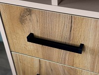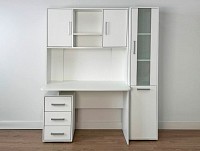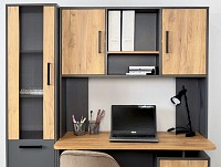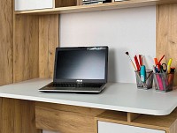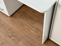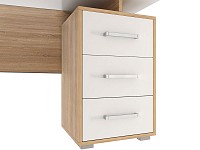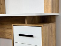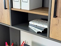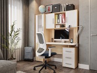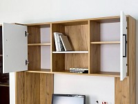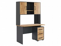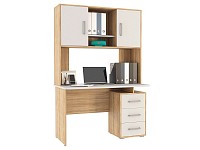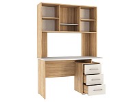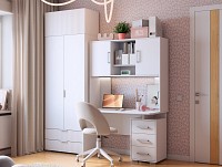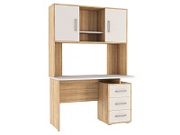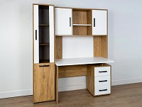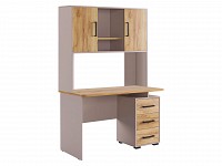 Просторная столешница подходит для работы и учебы, а надстройка с распашными шкафчиками и открытой нишей обеспечит удобное хранение книг, документов и аксессуаров. Напольная тумба с тремя выдвижными ящиками позволит держать под рукой всё необходимое. Лаконичный дизайн с сочетанием светлых фасадов и фактуры дерева гармонично смотрится в современном интерьере.