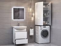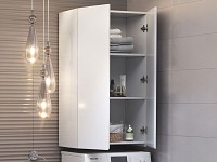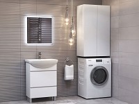 Конструкция экономит пространство, позволяя разместить необходимые аксессуары, косметику и моющие средства. Влагостойкие материалы обеспечивают привлекательный вид и долговечность мебели. Интегрированные ручки делают эксплуатацию более комфортной.