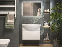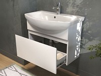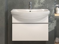 Внутри удобно хранить полотенца и моющие средства. Матовый фасад с интегрированной ручкой смотрится минималистично, его поверхность устойчива к влаге и легко очищается от загрязнений.