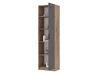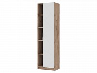 Открытые ниши подходят для книг или декора, который придает интерьеру индивидуальность. За распашной дверцей можно спрятать личные вещи. Ассиметричный узор на фасаде и сочетание матовой поверхности с текстурой дерева создают акценты меблировки.