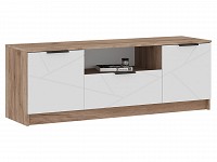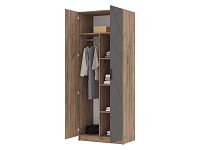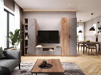 Практичное наполнение представлено функциональной и стильной мебелью с ассиметричным узором на фасадах. Матовая поверхность удачно сочетается с природными оттенками, позволяя создать уютную атмосферу в комнате.