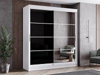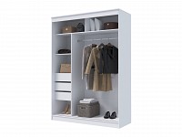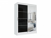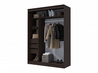 На штангу можно повесить верхнюю одежду, костюмы и платья, а на полках — разместить коробки, предметы быта и сумки. Небольшие выдвижные ящики удобны для аксессуаров и различных мелочей. Вставки на фасадах из черного лакобеля смотрятся стильно и придают мебели привлекательный облик.