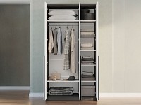 Внутреннее наполнение обеспечивает аккуратное хранение всего необходимого: от верхней одежды до постельного белья. Акценты в дизайне сделаны на простую геометрию. Тонкие вертикальные ручки гармонично дополняют фасады, не перегружая интерьер.