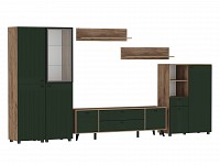 Практичный набор мебели позволяет создать сбалансированный и гармоничный интерьер. Просторные шкафы, удобная ТВ-тумба и навесные полки обеспечивают место для хранения книг, декора и техники. Контраст матовых фасадов и элементов в теплом древесном оттенке добавляет обстановке нотки уюта.