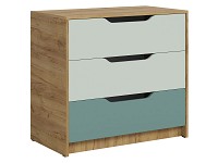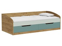 Зона отдыха представлена тахтой с бортиками, которые обеспечивают безопасность во время сна. Под спальным местом расположены выдвижные ящики для постельных принадлежностей и игрушек. Шкаф, стеллаж и комод оснащены множеством разноплановых отделений для хранения одежды, книг и других вещей. Удобные ручки-прорези придают мебели стильный вид.