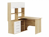 На просторной поверхности поместятся стационарный компьютер или ноутбук, а также оргтехника. В выдвижных ящиках удобно хранить канцелярию и прочие полезные мелочи. На открытых нишах можно расположить файлы с документацией, а за распашными дверцами — спрятать личные вещи.