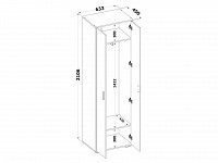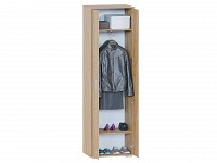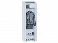 Внутри узкой конструкции расположены выдвижная поперечная штанга для плечиков и полки, куда можно поставить сумку и сменную пару обуви. Лаконичный дизайн и практичное наполнение делает шкаф универсальным решением для современного дома или офиса.