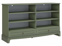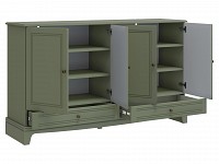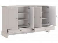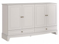 Фасады украшены фрезеровкой и лаконичными ручками, что подчеркивает элегантность модели. Качественная фурнитура обеспечивает плавный ход ящиков, а отделения за распашными дверцами позволяют удобно разложить вещи по разным категориям.