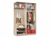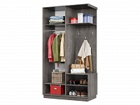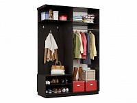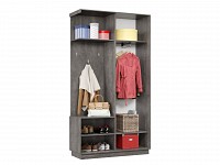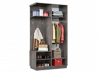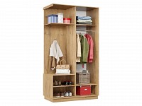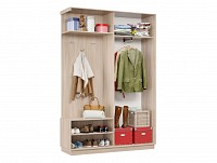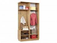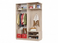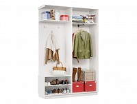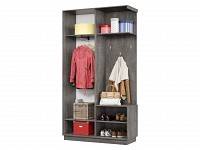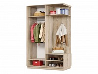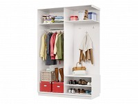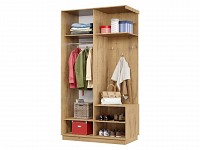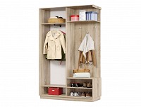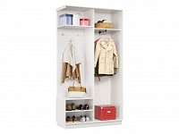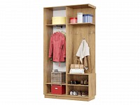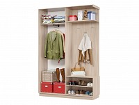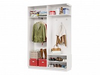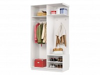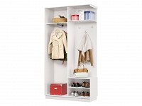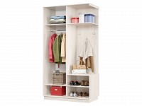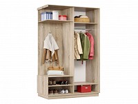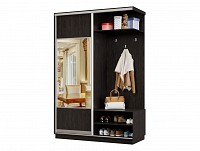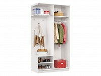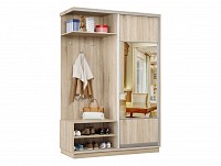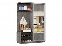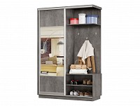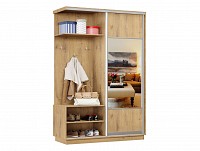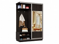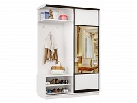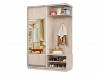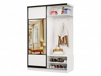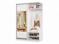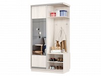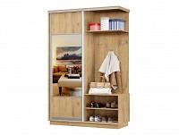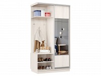 Модель оснащена двумя функциональными отделениями: одно — со штангой для вешалок, другое — с полками и крючками для верхней одежды. Благодаря роликовым направляющим дверь плавно перемещается вправо и влево, поочередно открывая и закрывая каждую из секций. Зеркальная вставка на фасаде сделает помещение визуально просторнее.