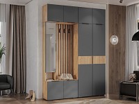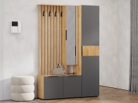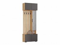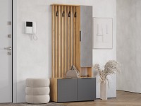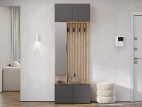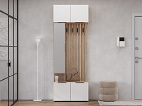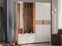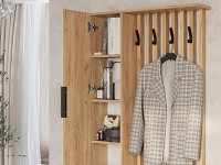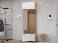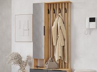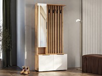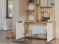 Компактная и визуально легкая конструкция выполнена в натуральных природных оттенках с минималистичной фурнитурой, которая не нарушает лаконичного стиля. За распашными дверцами можно спрятать обувь и аксессуары, а на крючках — аккуратно развесить повседневную одежду.