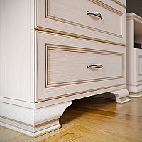 Нежная текстура дерева в сочетании с золотой патиной придают изделиям богатый и роскошный вид. В комплект входят все необходимые предметы меблировки для организации практичного и функционального пространства.